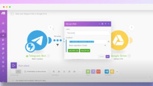In the final third module Google Drive upload the file by selecting the location My Drive – /Transit /Telegram files and map it automatically to the previous step by marking the „Telegram Bot – Download a file“ field.