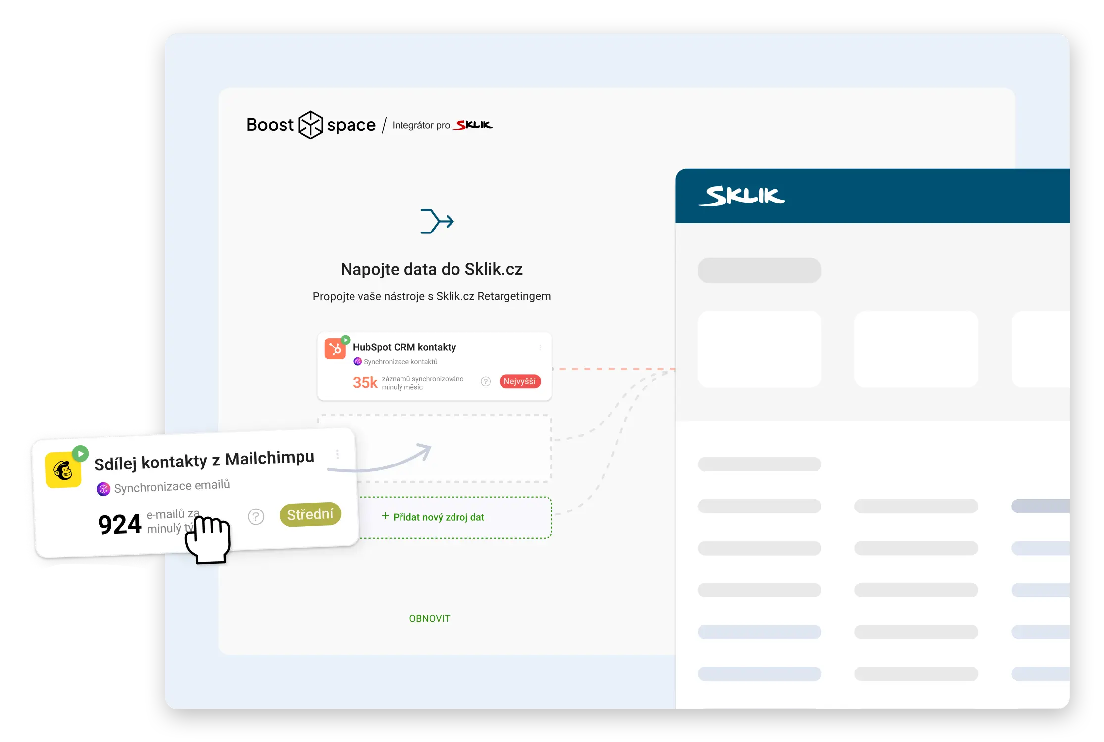 Connect CRM tools, e-shops, web forms, and other contact sources directly to your Sklik retargeting audiences and improve long-term ad performance with faster delivery and smarter targeting. All fully automated and no coding required.
