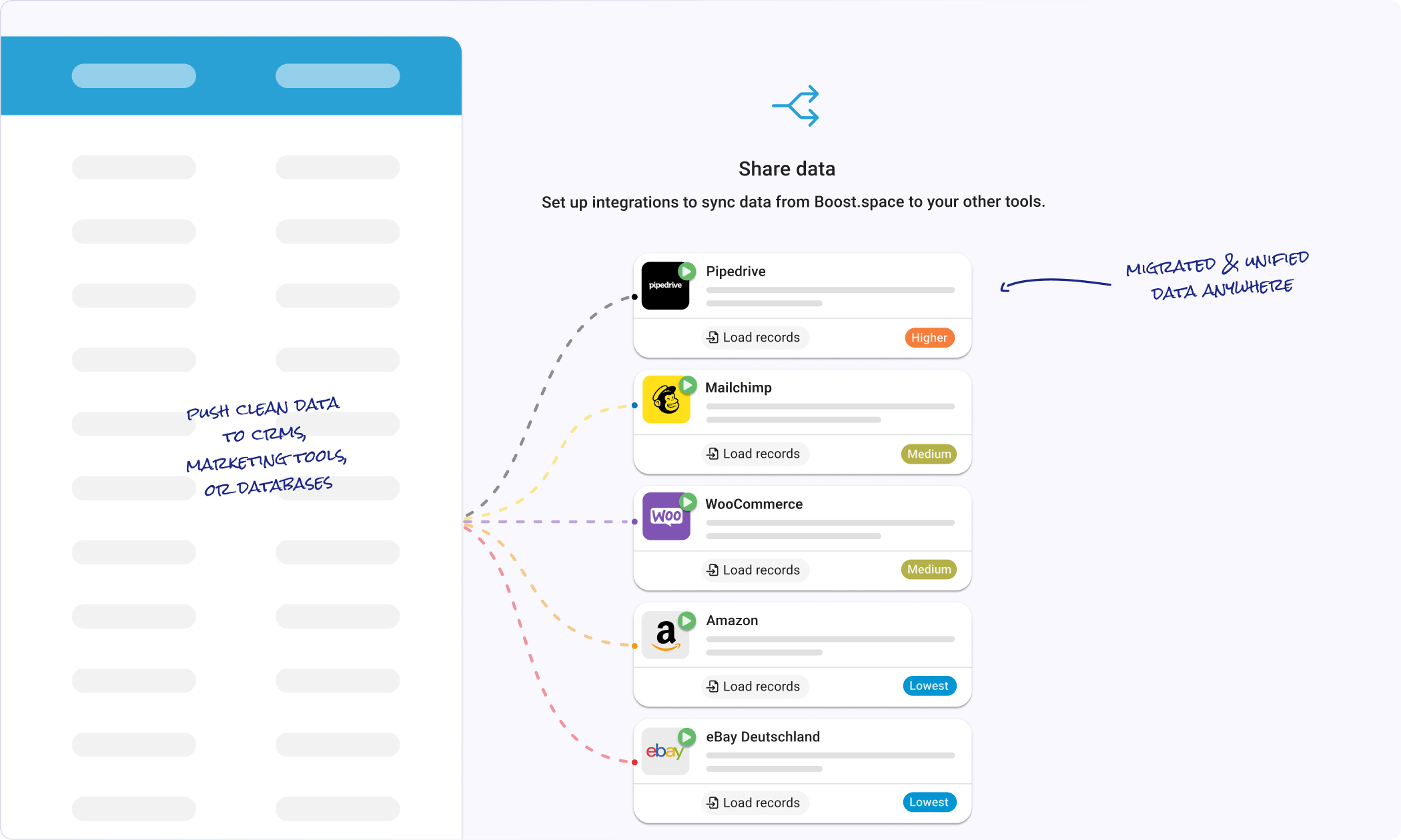 Boost.space handles all the heavy lifting: reformatting, cleaning, and preparing your data for its new destination. Your data arrives ready to use, without the hassle.
