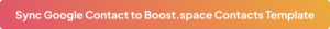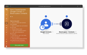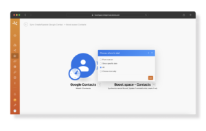 In both modules, create or select your connections. In the Google Contacts module, choose to synchronize “All” contacts. In the Boost.space part, choose the created space, and voila, you have created a scenario. But don’t run it just yet!