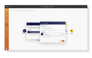 Step 1: Create a webhook with the offered connection (name of the integration you just created API token to). Step 2: Create or select the offered connection in the connected tool (here Mailchimp), and the List ID. Same goes for the step 3-6.